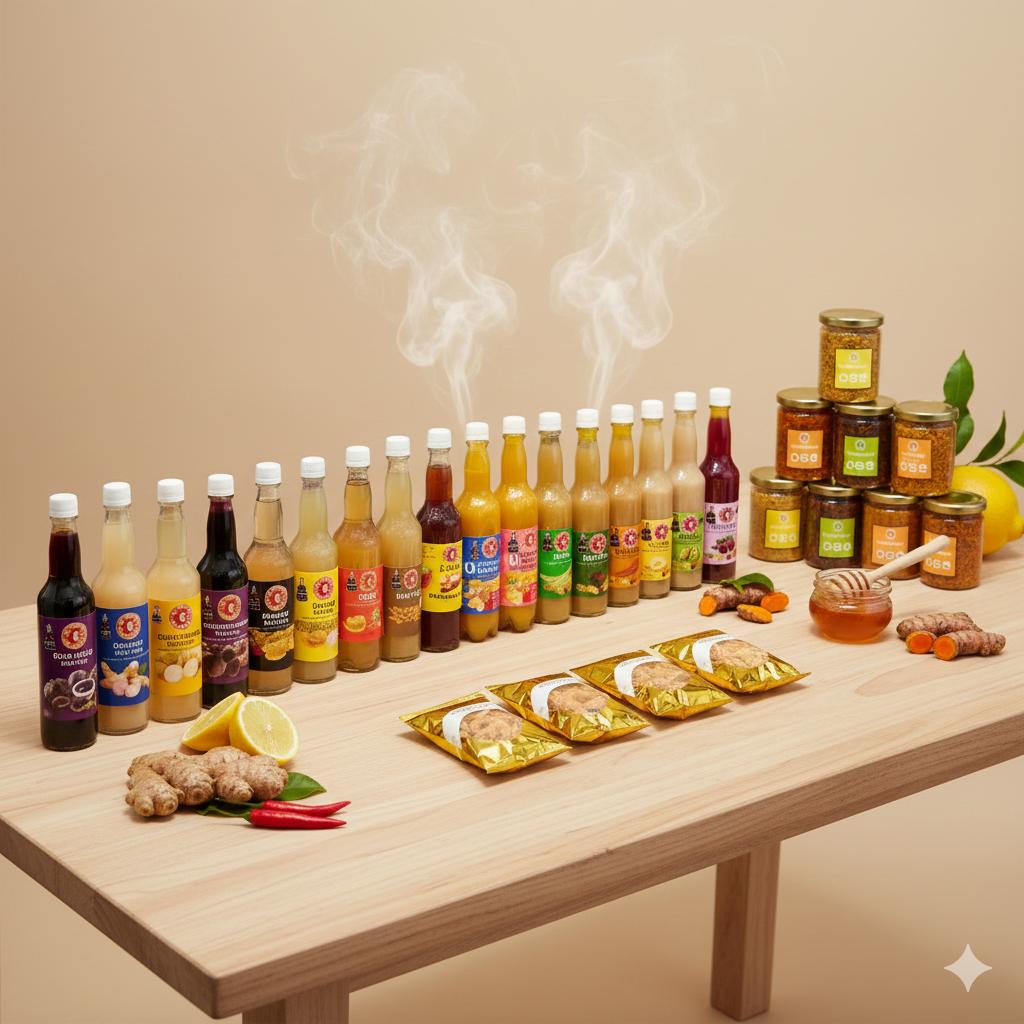 1. Ginger ,2. Garlic ,3. Turmeric ,4. Red Ginger ,5. Ginger Extract ,6. Pure Honey ,7. Ginger Shot ,8. Ginger Boster ,20. Lemongrass ,21. Pandan ,33. Herbal Extract ,34. Carrot ,35. Cucumber ,36. Dragon Fruit ,37. Berries ,38. Grape ,39. Banana ,40. Avocado ,41. Durian ,42. Kiwi ,43. Beetroot ,44. Ginger Soda ,45. Ginger Plus ,46. Ginger Lemon Tea ,47. Ginger Lemon Green ,48. Ginger Soya ,49. Ginger Milk ,50. Coconut Ginger ,51. Black Turmeric ,52. Yellow Onion ,53. Black Garlic ,54. Galangal ,55. Red Onion |