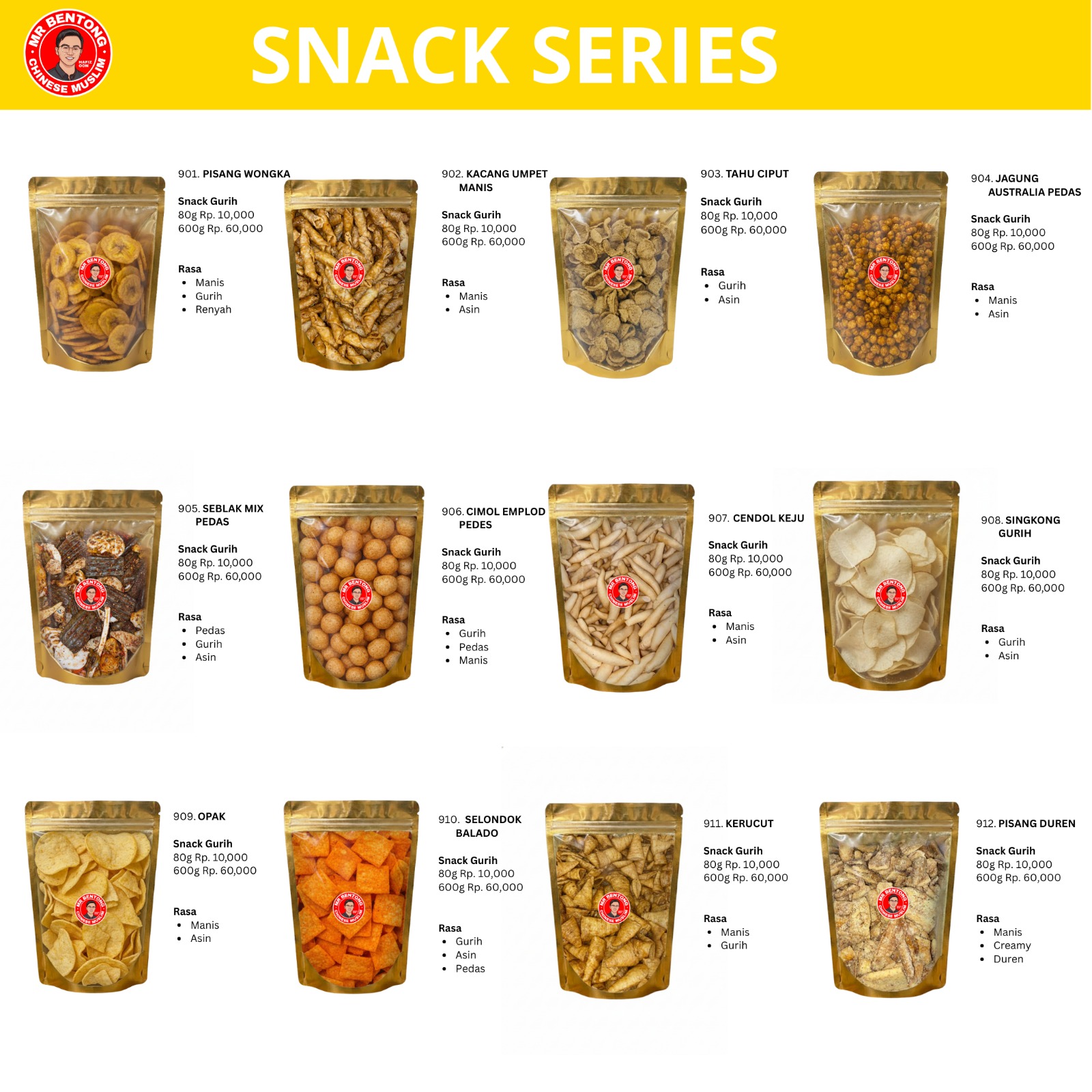 [ID/MY] Mr. Bentong Savory Snack Series (Varian 901-933) – Aneka Camilan Gurih Premium Ceriakan setiap momen kumpul keluarga atau waktu santai Anda dengan koleksi Camilan Gurih dari Mr. Bentong. Kami menyajikan puluhan varian camilan pilihan dengan tekstur super renyah dan bumbu rempah yang kaya akan rasa asin, gurih, dan pedas. Pilihan ideal bagi pecinta Basreng, Seblak, aneka Keripik, dan olahan Kacang. Dikemas secara higienis dalam pouch emas eksklusif berpenutup rapat (ziplock) untuk mengunci kerenyahan agar selalu sempurna.