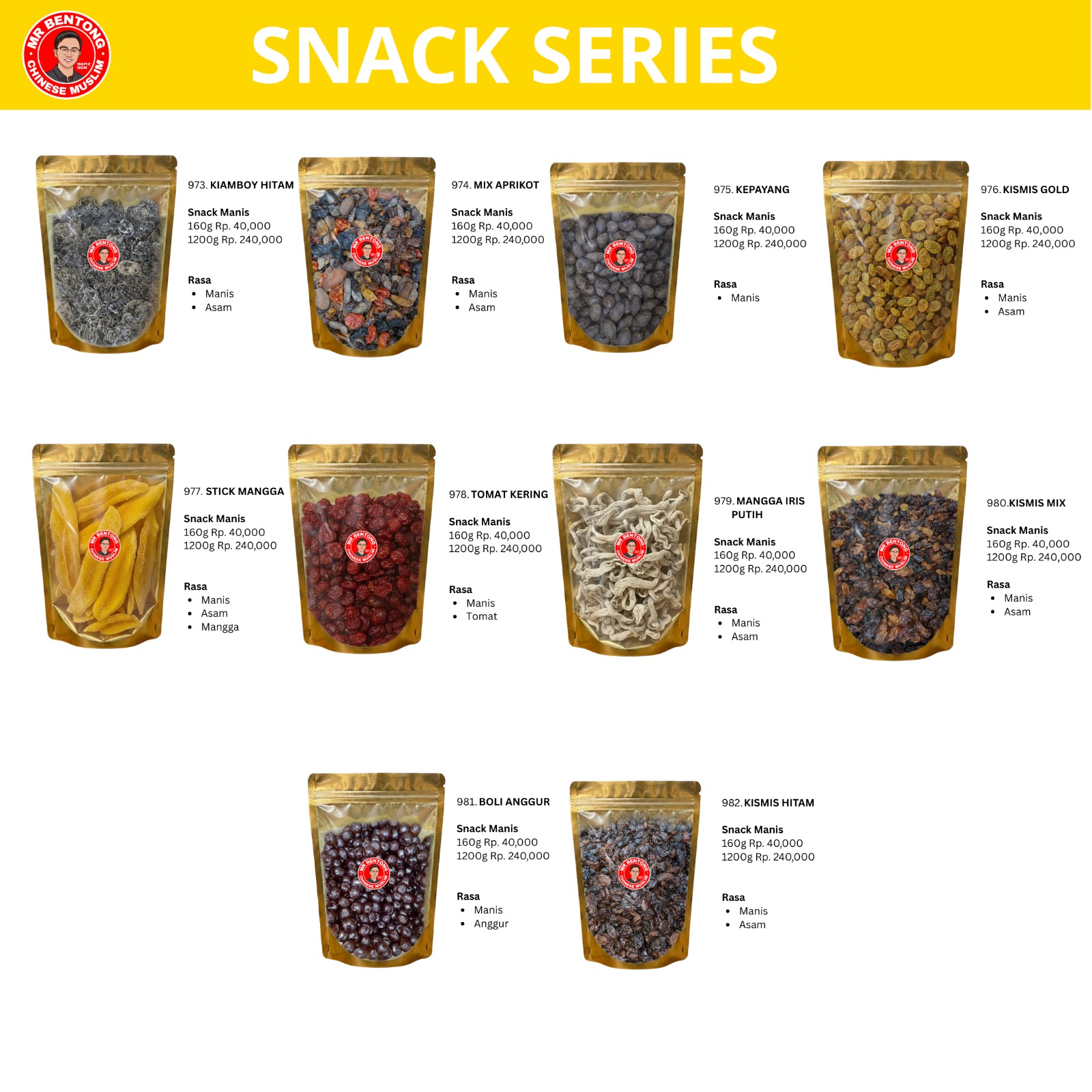 [EN] Mr. Bentong Sweet Snack Series (Variants 934-982) – Premium Sweet Treats Treat yourself to light desserts from the Mr. Bentong Sweet Snack collection. We offer a variety of options with mouth-watering sweet and sour sensations. The perfect choice for fans of chewy Gummy Candies, Chocolate Pebbles, Raisins, and Dried Fruits. Neatly packed in exclusive gold resealable stand-up pouches (ziplock) to maintain perfect freshness and sweetness.