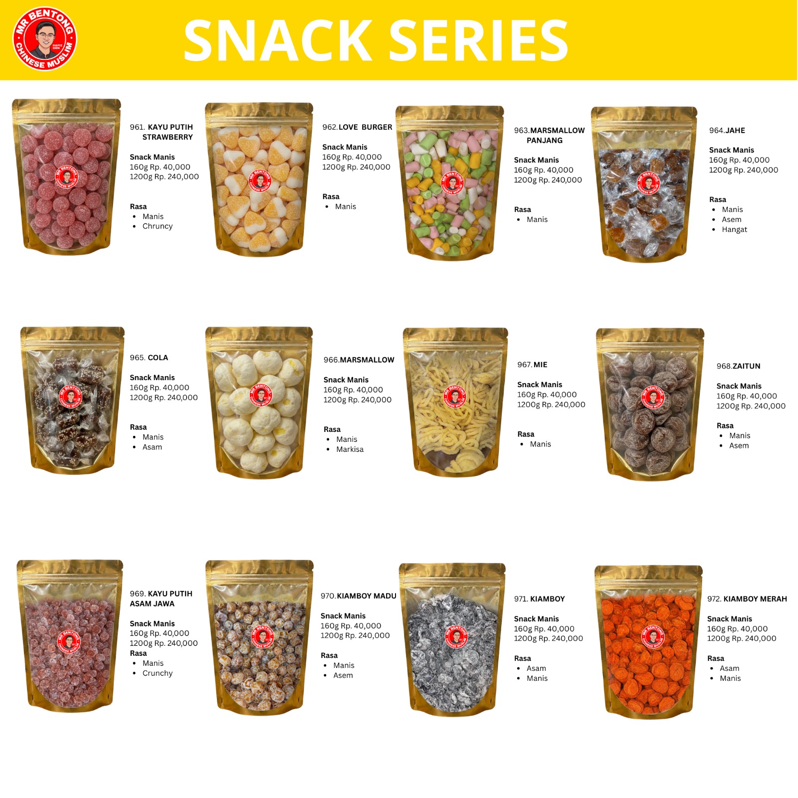 [ID/MY] Ceriakan hari Anda dengan sensasi manis dan segar dari koleksi Camilan Manis Mr. Bentong (Varian 934-982). Tersedia aneka Permen Gummy, Cokelat premium, hingga Manisan Buah. Hadir dalam ukuran mantap 160g dan kemasan curah 1200g.